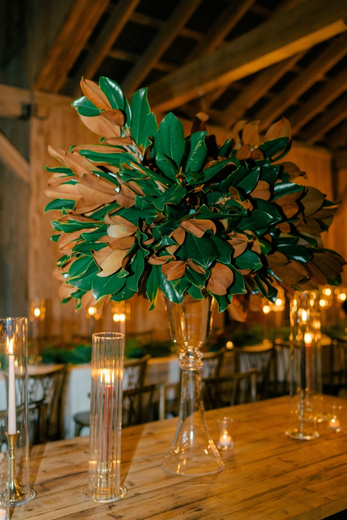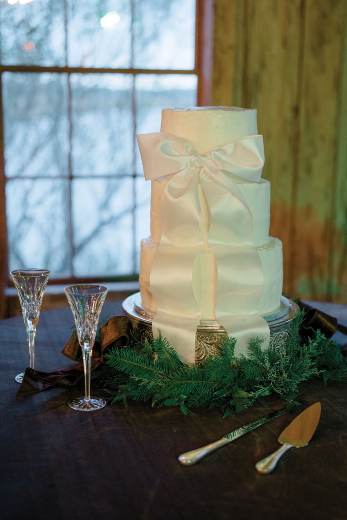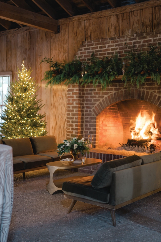 The Benkos’ very merry day dazzled with a dozen Frasier firs dressed in string lights, a roaring wood fire, a bow-adorned cake baked by a family friend, and handmade oyster shell ornament favors. Even Santa Claus (played by a groomsman) made a jolly entrance for a ho ho hoedown on the dance floor before the couple made their exit with jingle bells ringing.