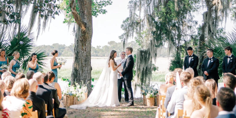 And though Jonny had arranged for Carrie’s family and friends to fly cross-country for the proposal, when it came to the wedding Carrie wanted to head home. Thus with a vision of showing off her Lowcountry roots and their affinity for vintage pieces, the couple brought in Ooh! Events to dress Edisto’s Middleton Plantation with farmhouse tables, driftwood bars, and fresh, country flowers. Above all, “We wanted our guests to have a seriously good time,” says Carrie. And that they did. “Every single second was a blast,” she says.